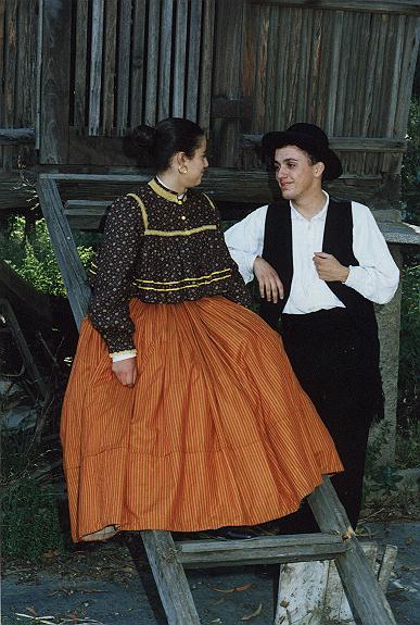Mulher - Camisa, dois saiotes de algodão ou um saiote de flanela vermelha, blusa e saia de algodão (chita), avental e colete também em algodão ou linho. Na cabeça lenço de algodão e chapéu de palha. Nos pés uns tamancos sem meias.
